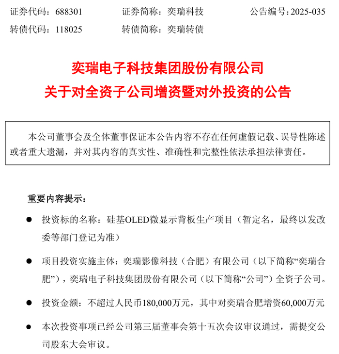 对于奕瑞科技此次投资公告显示,奕瑞合肥现有产能有限,且有一定的自用需求, 为完成特定客户及视涯科技要求的供应量,公司拟使用自有/自筹资金及视涯科 技提供的保证金,进一步购买相关设备并扩充产能。 为进一步提升公司盈利能力和综合竞争力,公司拟通过奕瑞合肥投资不超过人民币180,000 万元,其中公司对奕瑞合肥增资60,000万元,用于实施“硅基 OLED微显示背板生产项目”;本项目完成后,公司将新增硅基OLED微显示背板产能5,000张/月,并实现规模化量产。
