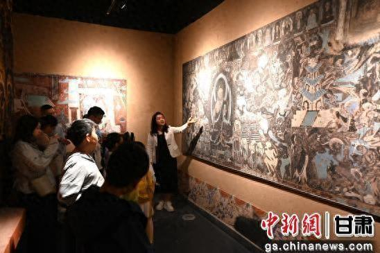 近年来,甘肃省敦煌市深入挖掘特色资源,打出拉动文旅消费“组合拳”,推出旅游优惠政策措施、智能化体验服务和低空飞行、旅拍、鸣沙山月牙泉景区万人星空演唱会、敦煌文化研学、敦煌文创等文旅项目产品,不断丰富文旅业态,打造消费场景,优化消费环境,提升旅游体验,点燃消费热情,不断激发文旅消费新动能。据敦煌市文旅部门统计数据显示,今年1至4月份,敦煌市旅游接待人数538.78万人次,同比增长25.8%。图为5月4日,在敦煌小镇美术馆,研学导师为游客讲解敦煌壁画故事。张晓亮 摄
