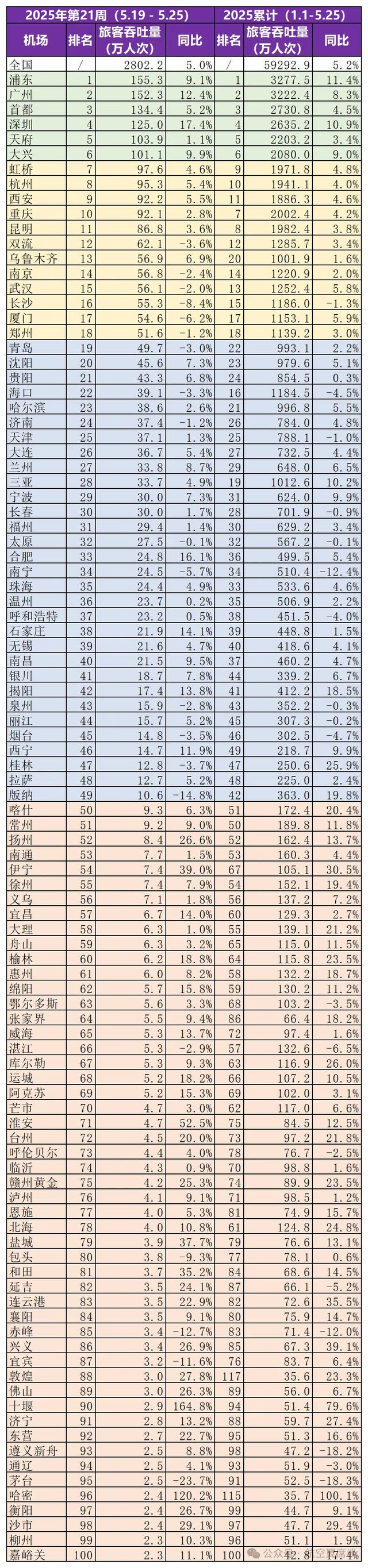 2025年第21周(2025年5月19日至5月25日),全国机场: