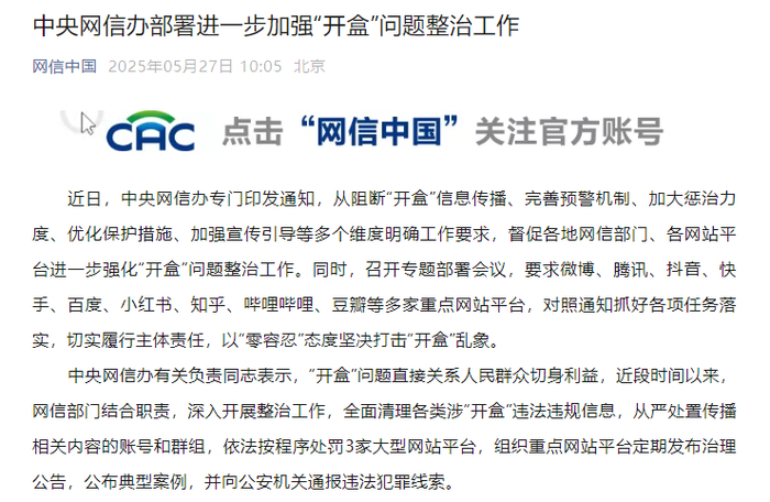 中央网信办有关负责同志表示,“开盒”问题直接关系人民群众切身利益,近段时间以来,网信部门结合职责,深入开展整治工作,全面清理各类涉“开盒”违法违规信息,从严处置传播相关内容的账号和群组,依法按程序处罚3家大型网站平台,组织重点网站平台定期发布治理公告,公布典型案例,并向公安机关通报违法犯罪线索。