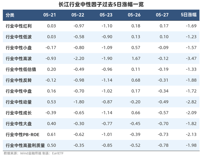 从长江证券战略数据组公布的行业中性因子指数来看,表现最好的三个因子的依次是红利、低波、小盘,表现最差的三个因子依次是高盈利质量、PB-ROE、大盘。