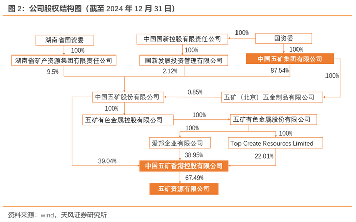 背靠央企五矿集团,全球资源国际化运营。公司的实控人为中国五矿集团,中国五矿通过子公司五矿中国香港持有五矿资源67.49%股权,股权结构较为集中。中国五矿的国际业务包括金属矿产的开发、生产、贸易和综合服务,以及金融、地产和物流业务。通过与实控人中国五矿合作,公司可以利用中国基本金属市场的广泛网路及分销管道,并从中国五矿获取技术支持,带来国际化运营的竞争优势。