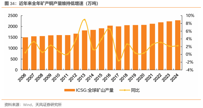 矿端干扰事件频发导致铜精矿产量增量受限。据ICSG数据,2024年全球矿产铜产量2288.4万吨,同比+2.2%,增量仅50万吨,ICSG预测2025年、2026年全球铜矿产量增速分别为2.3%及 2.5%,继续维持低增速。从 2025年铜产量指引来看,包括自由港在内的多个矿企下调2025 年铜产量目标,第一量子与巴拿马政府的Cobre铜矿谈判陷入僵局仍无复产时间表,矿端紧缺或持续发酵。