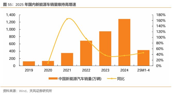 新能源车单车用铜量较高,产销高景气有效补充铜需求。新能源车用铜量高于传统汽车,电机内部大量使用电阻及铜圈,连接器、锂电铜箔和线束成为用铜增量来源,充电桩也成为助推铜需求增长的重要领域。据国际铜业协会和IDTechEx,纯电动乘用车平均单车用铜量约为83千克,达传统燃油车的3-4倍。2023年,在年初新能源补贴退坡以及燃油车降价抢占市场份额的背景下,国内新能源汽车销量944.8万辆,同比+37.5%;2024年,国内新能源汽车销量达1285.8 万辆,同比+36%;2025 年 1-4 月,国内新能源汽车销量429.8万辆,行业维持了较高的景气度。