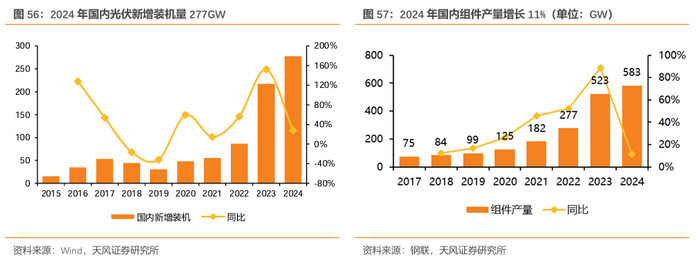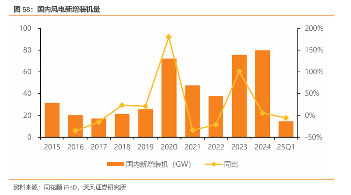 近年来我国光伏领域保持高增速,拉动铜需求增量。2024 年,国内光伏新增装机容量277GW,同比+28%,在高基数的基础上仍保持较快增速,国内风电新增装机容量79.82GW,同比+5.5%。2025 年一季度,我国光伏发电保持高速增长态势,新增装机容量达59.71GW,同比+30.5%;风电略有下滑,新增装机容量14.62GW,同比-5.7%。风光新能源合计新增装机占总新增发电装机容量的86.7%,我国能源结构绿色转型正加速推进。