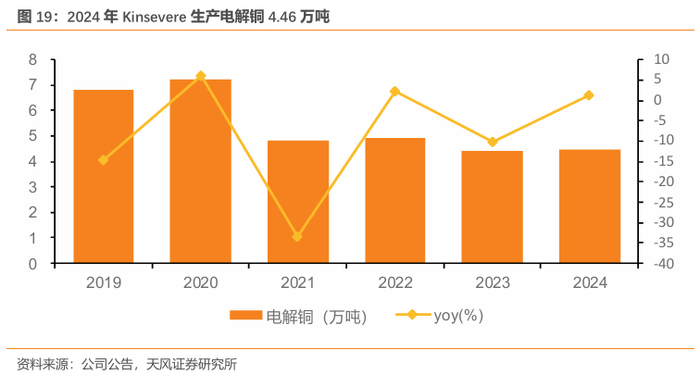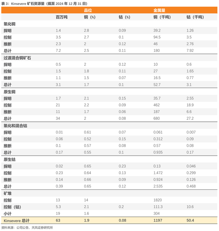 矿山产品以电解铜为主,矿权许可重续工作开始推进。Kinsevere矿山拥有年产3.9-4.4万吨电解铜的能力。截至2024年12月31日,Kinsevere拥有铜矿石资源量5714万吨,钴矿石资源量586万吨,折合约有120万吨铜金属量。2023.6.30-2024.6.30期间, Kinsevere 矿床 Saddle 区的加密钻探和资源扩展钻探使矿产资源量增加 150 千吨铜,而2022年和2023 年期间对新的卫星矿体 Kimbwe-Kafubu 的钻探,使矿产资源量新增 64 千吨铜和 2 千吨钴。矿山与 Gécamines 进行了持久谈判以延长《勘探和期权协议》的期限,目前 Mwepu 矿权区已经让渡。
