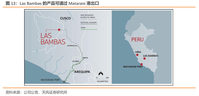 地理位置优越,资源出口便捷。Las Bambas位于秘鲁南部的安第斯山脉,距 Cusco西南偏南约75公里,Arequipa西北偏北约300公里。Las Bambas附近的交通条件良好,可通过良好的砾石道路抵达Cusco 及 Arequipa,产出的铜精矿可通过公路及铁路运往 Arequipa的Matarani 港口,然后海运出口。
