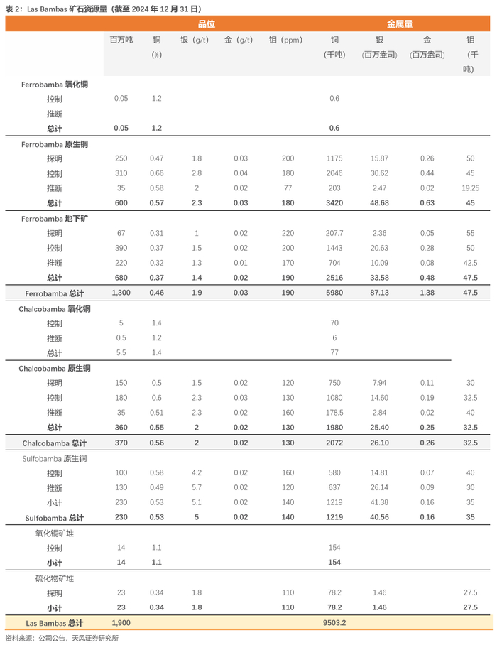 资源丰富,开采年限长。Las Bambas矿山采用传统选矿方法生产铜精矿,副产品包括金、银和钼精矿,矿山年限预计在20年以上。截至2024年12月31日,Las Bambas拥有矿石资源量 19 亿吨,铜资源量约 950 万吨。2023 年 6 月 30 日以来,Las Bambas 矿山 Ferrobamba 深部的新矿产资源,为矿产资源量增加了 2.5 百万吨铜、130 千吨钼、31 百万盎司银及 370 千盎司黄金。
