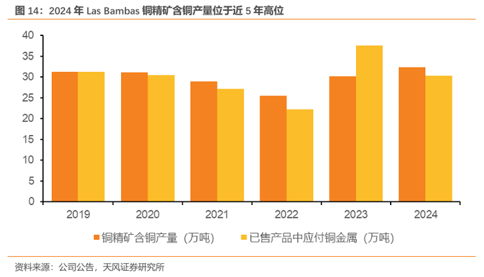 24年生产业绩强劲,25年产量预计提升。2024年Las Bambas生产32.29万吨铜,同比+7%,占公司铜总产量的80.78%。这一增长主要得益于Chalcobamba矿坑的开采和矿山全年无中断的运营。公司预计2025年Las Bambas的产量有提升,全年铜精矿产量在36-40万吨之间。这一预测产量的上端是基于 Chalcobamba 矿坑和 Ferrobamba 矿坑全年持续生产,且秘鲁无重大社会动荡,下端是基于对运营中断天数和矿石品位变化的保守假设。
