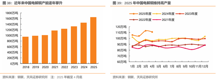近年来中国电解铜产能逐年攀升,新增产能有望在26年之后放缓。据钢联数据,2024我国电解铜产能为1453万吨,同比增长9.9%,而截至2025年4月,我国电解铜产能增长至1648万吨,较2024年末增长13.4%,2024- 2025年国内大量冶炼产能投产。2025年工信部等十一部门联合发布《铜产业高质量发展实施方案(2025- 2027)》,其中提及新建矿铜冶炼项目原则上需配套相应比例的权益铜精矿产能,国内冶炼新增产能有望在 2026年之后放缓。产量方面,2025年1-4月电解铜产量均突破100万吨,为近年来最高水平,1-4月国内电解铜累计产量为433.8万吨,同比增加11.30%。