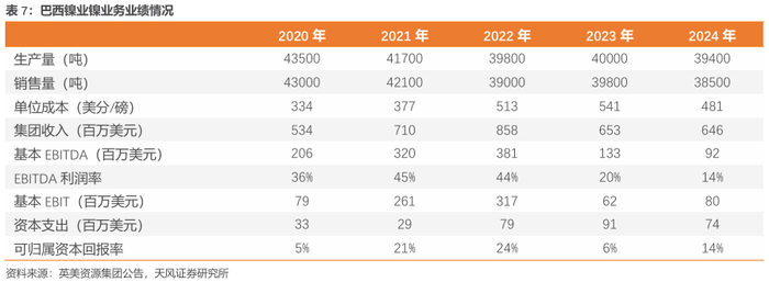 价格销量走低,24年业绩下滑。2024年,巴西镍业基本EBITDA下降31%至9200万美元,原因是实现价格和销售量的下降抵消了C1单位成本降低的收益。C1单位成本下降11%至481 美分/磅,主要受巴西雷亚尔贬值、能源投入成本降低和工艺效率提升的推动。资本支出下降19%至7400万美元,主要是由于前一时期资本化的剥离成本增加。