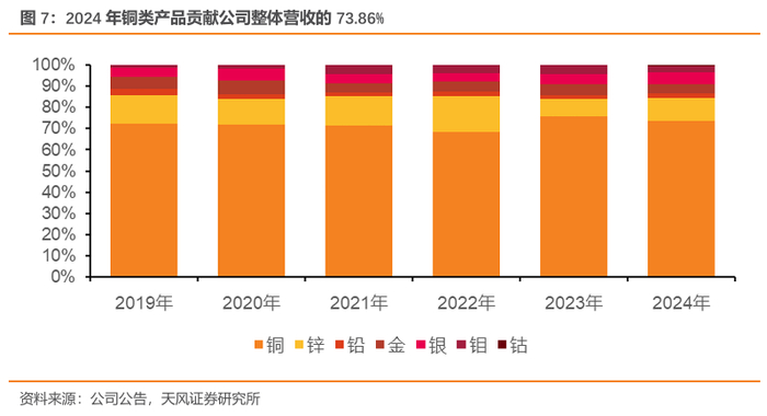 按照产品划分,铜类产品为公司营收的主要贡献项。2024 年,铜类产品共实现营业收入33.08 亿美元,占公司营收总额的73.86%。铜类产品销售37.87万吨,其中Las Bambas销售30.29 万吨,占比79.98%。锌类产品为第二大贡献项,2024年实现营业收入4.81亿美元,占公司营收总额的10.74%。锌类产品共销售18.49万吨,其中Dugald River销售13.69万吨,占比74%。