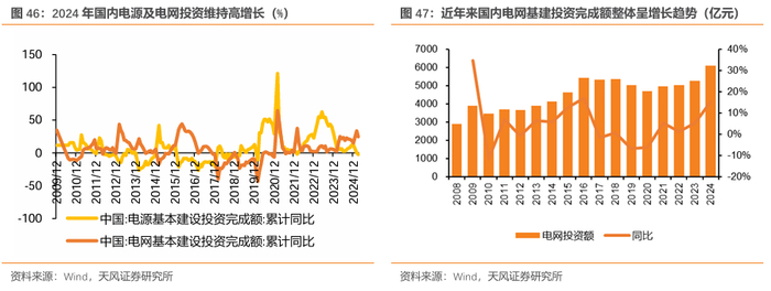 电力行业消费铜主要包括发电端、输变电和配电等领域,以电线电缆用铜最多。2024年国家电网基本建设投资完成额6083亿元,同比+15.3%,实现大幅增长,2025Q1电网完成额累计同比+24.8%,维持高增速。十四五期间电网投资将维持高位,对铜需求形成托底作用。