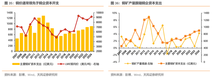 高铜价对资本开支刺激作用减弱,低资本开支限制中期铜矿供给。铜矿资本开支与铜价相关性强,2013 年后铜价降低后资本开支低迷,使得后续铜矿产量增速下滑。2021 年虽然铜价上涨,但铜矿资本开支水平较上轮高点仍有明显差异,我们认为主要是由于全球铜矿成本抬升,同样的价格对资本开支的刺激力度减弱,中长期看限制了铜矿未来供给。未来全球铜精矿增量主要来自于已有的铜矿扩建项目,世界级铜矿新投产项目数量不仅有限,而且新投产项目难以带动铜精矿增量。