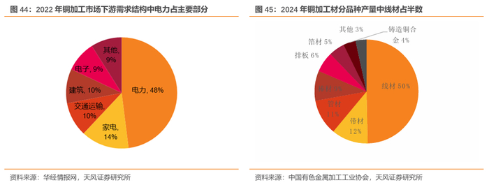 电力为国内铜主要应用领域。从终端消费领域来看,电力为主要消费领域,2022年需求占比达到48%,家电占比14%,交通运输/建筑/电子分别占比9%-10%。按品种分类,铜加工材以线材为主,2024年产量占比50%左右;带材/管材/棒材分别占9%-12%;排板/箔材/铸造合金分别占4%-6%。