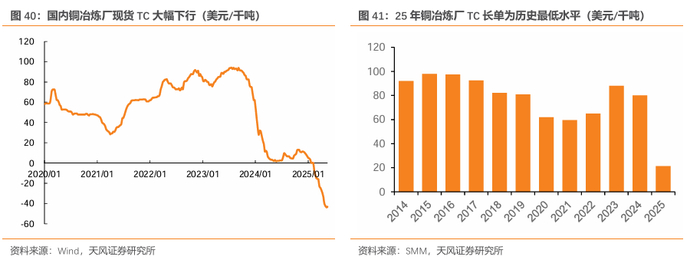 偏紧的矿端预期叠加冶炼产能的宽松带来TC/RC大幅下行。据钢联数据,2025年TC长单价格21.25 美元/干吨,同比2024年80美元/干吨下滑73%,为历史最低水平。而国内铜冶炼厂中型企业平均绝对成本线在25-30美元,个别贵金属回收较高的企业成本线更低一些,这一长单价格将导致国内铜冶炼厂出现大面积的亏损。2025年以来,现货TC同样一路下跌,截止2025年5月9 日,最新的TC为-43.6美元/干吨。