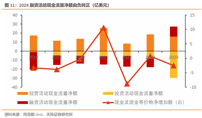 2024 年,由于Las Bambas铜精矿库存减少放慢导致不利的营运资本变动,公司经营活动现金流入净额同比减少13%至16.12亿美元;公司投资活动中现金流出净额同比增加276%至29.70 亿美元,则主要由于博茨瓦纳Khoemacau铜矿山股权收购和资本性支出;融资活动现金流量净额为11.04亿美元,主要由于股权融资和外部贷款。