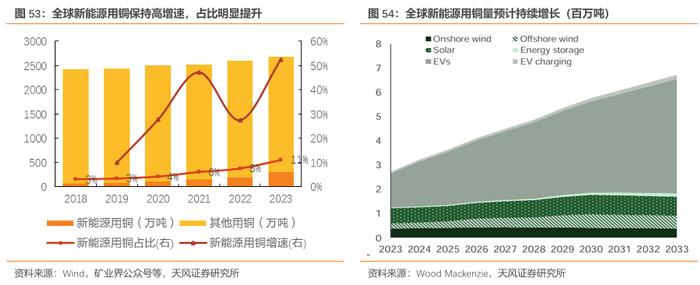 新能源用铜量保持高增速,成为全球铜消费增长主力。新能源消费主要集中于新能源车、风电和光伏,据我们测算,2023年全球新能源用铜量达298万吨,2018-2023年5年CAGR为25%,新能源用铜占比从3%提升至11%,预计24年新能源用铜占比进一步提升。中长期来看,在“双碳”背景下的新能源行业转型趋势中,新能源领域铜需求量有望持续增长,成为铜消费的重要支撑,根据紫金矿业与CRU预测数据,至2030年全球总铜需求量将达到约3000万吨,新能源用铜将占全球总用铜量的25%。