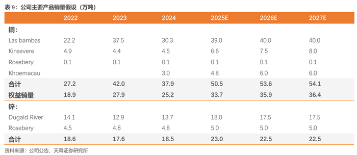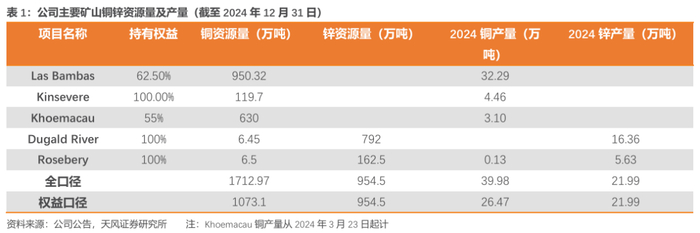 截至2024年12月31日,Las Bambas/ Kinsevere/ Khoemacau/ Dugald River/ Rosebery 分别拥有铜资源量950.32/119.7/630/6.45/6.5 万吨,合计 1712.97 万吨,权益资源量 1073.1万吨。Dugald River/ Rosebery 分别拥有锌资源量792万吨/162.5万吨,合计954.5万吨,权益资源量954.5万吨。2024年Las Bambas/ Kinsevere/ Khoemacau(从2024年3月23日起计)/ Rosebery 分别产铜32.29/4.46/3.10/0.13 万吨,合计39.98 万吨,权益产量26.47万吨;Dugald River/ Rosebery 分别产锌 16.36/5.63 万吨,合计21.99 万吨,权益产量21.99万吨。