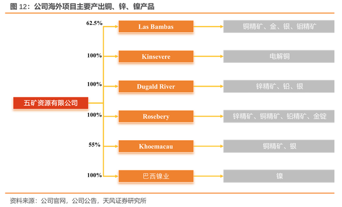 五矿资源总部位于澳大利亚墨尔本,在澳大利亚、刚果金以及秘鲁开发并运营铜、锌及其他基本金属业务。公司目前主要拥有并运营五家海外矿山,并于2025收购巴西镍业,是全球主要的铜锌镍等金属生产商。公司铜板块三大资产为Las Bambas、Kinsevere及Khoemacau项目;锌板块两大资产为Dugald River与Rosebery;2025年公司新涉足镍板块,收购英美资源位于巴西的镍业务。