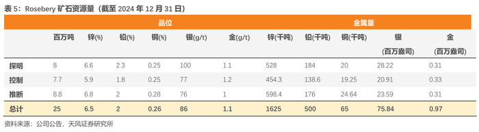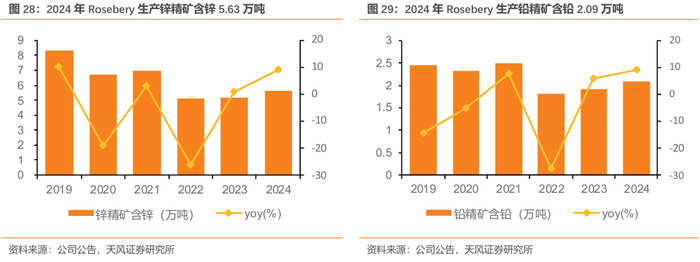 矿石品位较高,副产品金属贡献突出。2024年,受额外掘进工作的推动,采矿量和选矿量均超过100万吨,创下新高。生产锌精矿含锌/铅精矿含铅5.63/2.09万吨,同比+9%/+9%。2025 年公司预计,由于矿山将重点转向副产品生产,Rosebery锌精矿含锌产量预计为4.55.5 万吨,将较24年有所增减少。包括副产品金属的贡献在内,2025年的锌当量产量公司预期为11-12.5万吨。24年4季度,Rosebery实际生产锌精矿含锌/铅精矿含铅/铜精矿含铜1.45/0.56/0.04 万吨,同比-13%/-3%/+11%,生产情况良好。按锌当量计算,产量达3.44万吨,是锌产量的两倍多,主要得益于副产品金属的突出贡献。