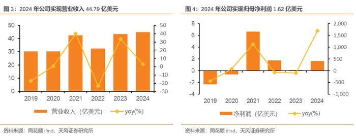 2024 年,公司业绩显现大幅改善。由于2023年的铜精矿出货量增加,消耗了2022年全国性堵路期间积累的库存,Las Bambas 的铜精矿和钼精矿的销量降低,但得益于Dugald River 和 Rosebery 的锌及铅精矿销量均走高,叠加铜、银、金、锌等产品价格上涨,公司实现营业收入44.79亿美元,同比+3.05%。得益于Las Bambas矿山的强劲表现、Khoemacau矿山的收购贡献以及其他矿山经营状况的改善,公司实现归母净利润 1.62 亿美元,同比+1698.89%。