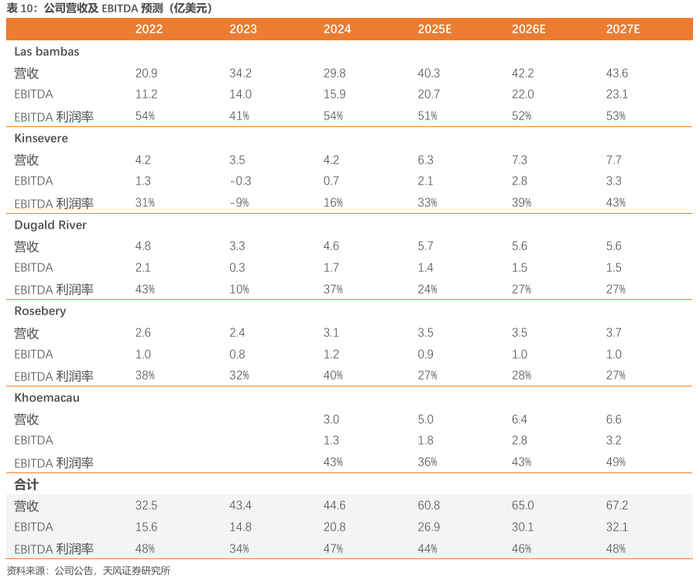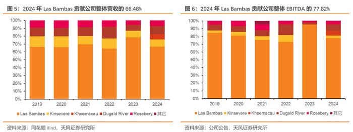 按照项目划分,Las Bambas为公司营收及利润的主要贡献项目。自2016年商业化生产以来,Las Bambas 即成为对公司营收贡献最大的项目。2024年,Las Bambas实现营业收入29.78 亿美元,占公司营收总额的66.48%,实现EBITDA 15.94亿美元,占公司EBITDA 的77.82%。Kinsevere 及 Dugald River 受产量下滑影响,对营收贡献自2022年的12.95%/14.88%缩小至2024 年的9.46%/10.31%,Dugald River 的 EBITDA 贡献率从 13.69%下滑至 8.27%,Kinsevere 的 EBIDTA 贡献率从8.58%下滑至3.31%。