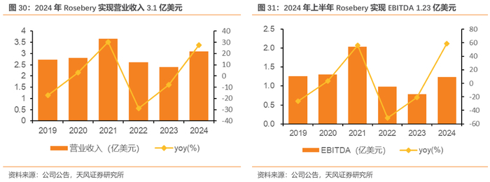 量价齐升,24年业绩稳中向好。2024年, Rosebery实现营业收入3.06亿美元,同比+28%,主要锌加工费下降,锌、金、银及铜价格上涨, 以及铅、贵金属、锌及铜的销量增加。总生产成本开支较2023年增加0.12亿美元,同比+8%。2024年,锌C1成本为负0.10美元/磅,相较于2023年为正0.26美元/磅,降低的原因是贵金属副产品收益走高、锌产量增加以及加工费降低。Rosebery 2025年的锌精矿含锌产量公司预期介乎45,000吨至55,000吨。2025年公司预计C1成本在0.25美元/磅至0.40美元/磅之间。C1成本上涨的原因在于估算中采用的副产品价格下降,以及锌加工费增加。