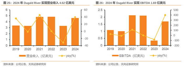 锌量价齐升促营收,24年业绩显著改善。2024年,Dugald River实现营业收入4.62亿美元,同比+39%,主要由于锌精矿销量增加、铅精矿销量增加、加工费降低、锌银价格上涨所致。总生产开支同比+5%,原因是开拓进尺和采矿量增加导致采矿成本上涨。2024年锌C1 成本为 0.65 美元/磅,2023年为 0.93 美元/磅,下降的主要原因是锌产量提高,加工费降低,以及副产品收益增加。2025年公司预计C1成本介乎0.75美元/磅至0.90美元/磅,较2024年有所上涨,原因是假设副产品价格降低且假设锌加工费上涨。