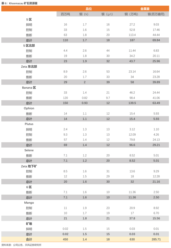 资源储量丰富,扩建潜能较大。Khoemacau为一座高品质运营矿山,拥有强大的扩建能力,位于非洲博茨瓦纳西北部卡拉哈里铜矿带。Khoemacau矿山拥有4040平方公里矿权,铜矿产资源量(按含铜金属总量计算)位列非洲第十,为中非铜矿带之外世界上最大的铜沉积系统之一。2021年6月,Khoemacao完成了其年产6万吨铜和160万盎司银精矿的建设,并于 2022 年四季度完成了业务升级,达到全面生产。根据其扩建项目的钻探和研究预测,Khoemacau矿山的年产量可能超过13万吨铜和500万盎司银。截至2024年12月31 日,Khoemacau 拥有矿石资源量4.5亿吨,铜金属量约630万吨,银金属量约28571万盎司。自2024年3月22日收购后,Khoemacau矿山5区钻探及Banana、Zeta及6区矿床的重新建模为矿石资源量增加了70万吨铜和3千万盎司银。