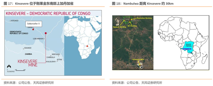 刚果金重点铜矿项目,卫星矿资源充足。Kinsevere 自 2007 年开始运营,于2012 年被五矿资源收购。Kinsevere 矿山位于刚果金东南部的上加丹加省,采用露天开采方式开采铜矿,并通过研磨、酸浸、萃取、电解等流程制取电解铜。Kinsevere 周边有 Sokoroshe II 及Nambulwa 等卫星矿,Sokoroshe II 位于Kinsevere 西部 25km,Nambulwa 距离Kinsevere约30km左右,均拥有一定的铜、钴资源量。