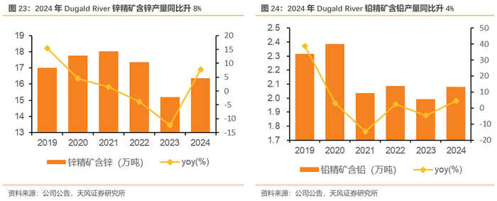 生产量提升,选矿效率持续优化。2024年,Dugald River生产16.36万吨锌精矿含锌,同比+8%。2024年4季度, Dugald River生产了4.95万吨锌精矿含锌,同比+5%,是该矿山历史上第二高的季度产量,得益于本季度创纪录高位的回收率、选矿量的增加,以及给矿品位的提升。2025年公司预计Dugald River全年锌精矿含锌产量预计在17.0-18.5万吨之间,将恢复至之前的产量水平。未来Dugald River矿山也将继续推进运营方面的改进,虽然矿山品位降低对产量存在一定影响,但选矿厂优化措施的持续进行使得回收率持续提升,将部分抵消矿石品位降低带来的负面影响。