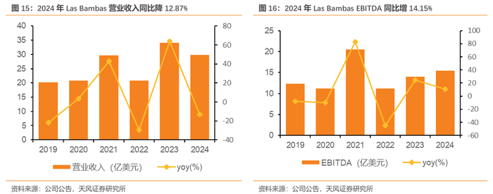 产品成本下降,带动盈利大幅增长。2024年Las Bambas实现营业收入29.78亿美元,同比-13%,主要原因是铜精矿和钼精矿的销量降低。销量降低反映了 2023 年精矿出货量的显著增加,消耗了2022年秘鲁全国性堵路期间积累的库存。总生产开支同比-2%,这主要是因为与 Chalcobamba 矿坑开发相关的递延采矿成本上涨,柴油、爆破品、试剂及研磨介质的单价降低,以及生产费用降低。综合作用下Las Bambas 24年实现EBIDTA 15.94亿美元,同比+14%。 2024年的 C1 成本为 1.51 美元/磅,较2023年的 1.60 美元/磅有所降低,原因是铜产量增加及现金生产费用降低。公司预测,Las Bambas 2025年的 C1 成本公司预计介乎 1.50 美元/磅至 1.70 美元/磅,高于2024年的实际水平。