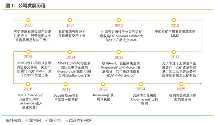 布局海外矿山项目,聚焦上游资源开发。1988年,公司在中国香港注册成立,初期经营范围以大宗商品贸易与加工为主,1994年于中国香港联交所上市。2009年,中国五矿通过子公司五矿有色收购OZ Minerals Limited的大部分资产,成立“Minerals and Metals Group”(MMG),布局旗下Century、Golden Grove、Rosebery及Sepon矿山,Dugald River及Izok Corridor发展项目以及一系列探矿权。2010年,公司收购MMG,并于2011年将贸易、加工及下游业务有条件地剥离至五矿有色,从而专注于上游基本金属资产。2012年,公司收购Anvil,布局刚果金Kinsevere矿山,2014年进一步提出联合购买专案布局Las Bambas。2016年,Las Bambas进入商业化生产,2017年Dugald River项目也产出第一批精矿。2022年,公司董事会批准Kinsevere扩建项目,2024年,公司完成对博茨瓦纳Khoemacau矿山的收购,矿山项目布局进一步扩展。2025年,公司收购英美资源于巴西的镍业务,标志着公司首次在巴西进行投资,并将镍加入到其矿产资源量及矿石储量当中。