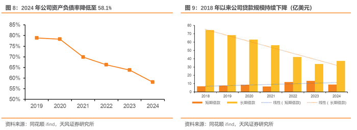 资产负债率逐渐优化,贷款规模持续下降。公司持续优化资产负债结构,截至 2024 年年末,资产负债率已下降至58.1%。贷款规模已由2018年的81.3亿美元持续降至2024年的46.29 亿美元,贷款规模的下降将有助于公司减轻财务费用压力。
