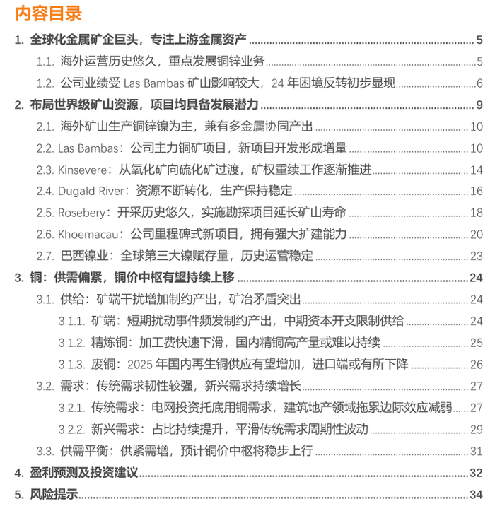 运营海外矿山,主营铜、锌以及最新收购的镍业务。五矿资源目前主要拥有并运营五家海外矿山,收购巴西镍业,是全球主要的铜锌镍等金属生产商。铜板块,Las Bambas由五矿资源持股62.5%,生产铜精矿,Kinsevere 项目生产电解铜,Khoemacau 项目作为24年完成收购的新项目,主要产出铜精矿。锌板块,Dugald River与Rosebery矿山产出锌精矿。镍板块,2025年,公司收购英美资源于巴西的镍业务,镍赋存量约为 5.2 百万吨。此外,矿山还有金、银、钼、铅等副产品产出。