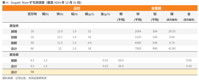 矿体模型改良,资源不断转化。Dugald River矿体规模较大,预计可开采20年以上,年矿石处理量可达170万吨左右,年生产锌金属量17.5-19万吨。截至2024年12月31日,Dugald River拥有7000万吨矿石资源量,折合约有792万吨锌金属量与99万吨铅金属量。2024年,Dugald River 的勘探钻探取得成功进展,延伸了 Dugald 矿脉的深度,使得矿产资源量净增加 1.2 百万吨锌。