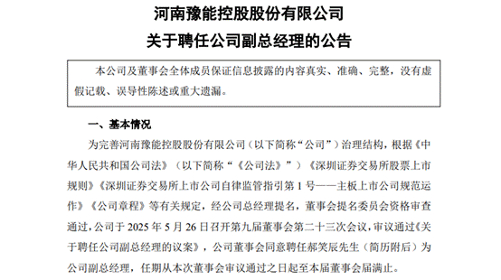 5月26日晚间,河南省属国资控股上市公司豫能控股发布公告称,经公司总经理提名,董事会提名委员会资格审查通过,公司董事会同意聘任郝笑辰为公司副总经理,任期从本次董事会审议通过之日起至本届董事会届满止。