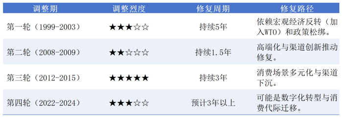 通过对比四次调整对比,政策性调整带来影响烈度最强,修复周期相对较短,而宏观经济环境与消费能力的影响较慢,但修复周期相对更长。