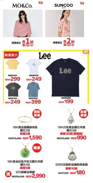 •时尚潮流矩阵:多个男女时尚潮牌,“摩安珂” 、“SUNCOO”、及“Lee”等特选商品低至1折起;百多澳门元即可把心仪品牌T恤带回家! 同时不用千元就能购入18k白色黄金钻石吊坠,为节日送礼提供超值选择!