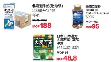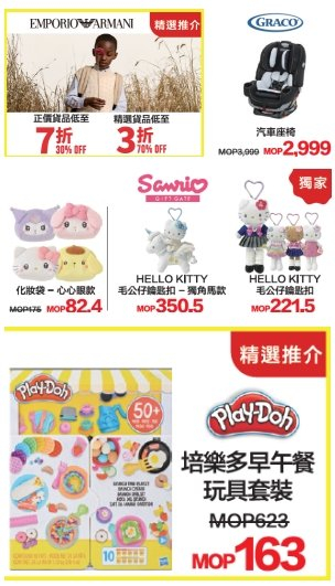 •亲子家庭天地:一众母婴产品、欧洲潮流童装、玩具及文具精品等低至二六折;培乐多玩具不用200澳门元可把整个套装带回家!把小孩的东西也一并趁优惠买下。