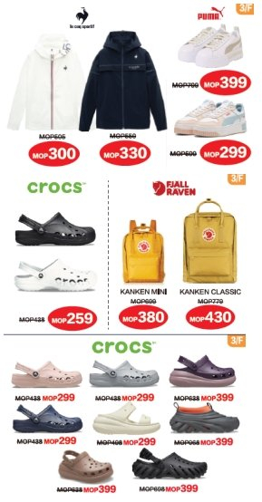 •运动休闲专区:“乐卡克”、“卡骆驰”及潮流单品“北极狐”等品牌推出 300 澳门元亲民价单品,涵盖户外装备与潮流单品,满足夏日出行需求。