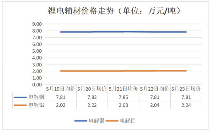 2025年5月19日-23日,电池级碳酸锂、四氧化三钴、硫酸钴、钴酸锂、磷酸铁锂(动力型)、磷酸铁锂(储能型)、5μm湿法基膜价格持续下跌;5/6/8系三元前驱体、5/6/8系三元材料、六氟磷酸锂/铁锂用/三元用/锰酸锂用电解液、7/9μm湿法基膜、方形三元电芯(523动力型)价格有所下跌;电池级硫酸镍、无水磷酸铁、锰酸锂(动力型)正极材料、负极材料、方形磷酸铁锂电芯(280Ah储能)价格保持稳定;16μm干法基膜价格有所上涨;电解铜、电解铝价格持续波动。