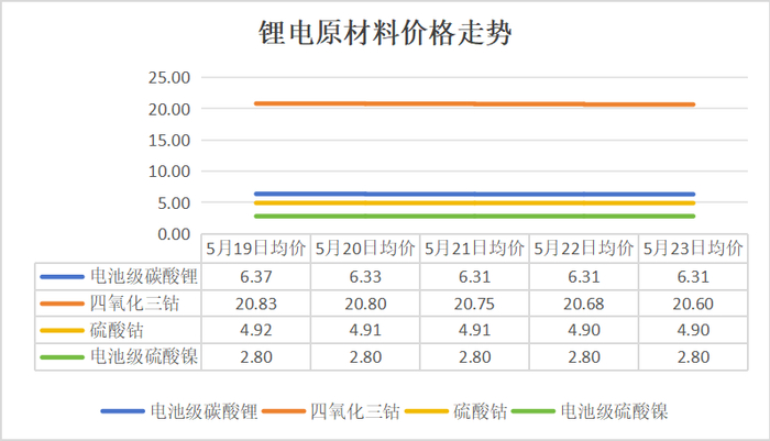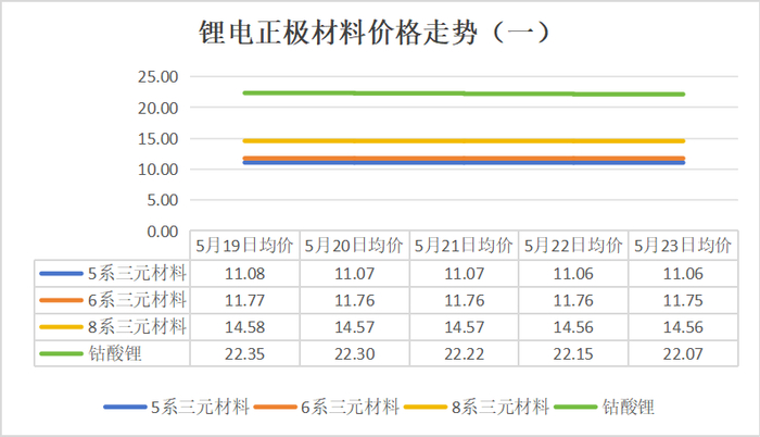 5/8系三元材料价格在5月20日、22日迎来下跌,均下跌0.01万元/吨,23日保持稳定。6系三元正极材料在5月20日、23日均下跌0.01万元/吨。钴酸锂材料本周连续下跌,周末价格较周初价格相差0.28万元/吨。