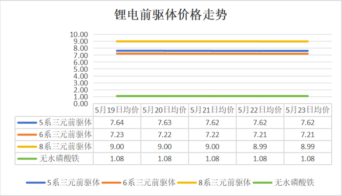 从正极前驱体来看,三元系前驱体价格纷纷走低。其中,5系三元前驱体与6系三元前驱体周末比周初均下跌了0.02万元/吨;8系三元前驱体于5月22日迎来下跌,下跌了0.01万元/吨;无水磷酸铁本周价格保持稳定。