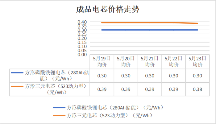 从成品电芯来看,方形磷酸铁锂电芯(280Ah储能)价格依旧保持稳定,方形三元电芯(523动力型)价格则在5月23日迎来下调,较前日下跌了0.01元/Wh。