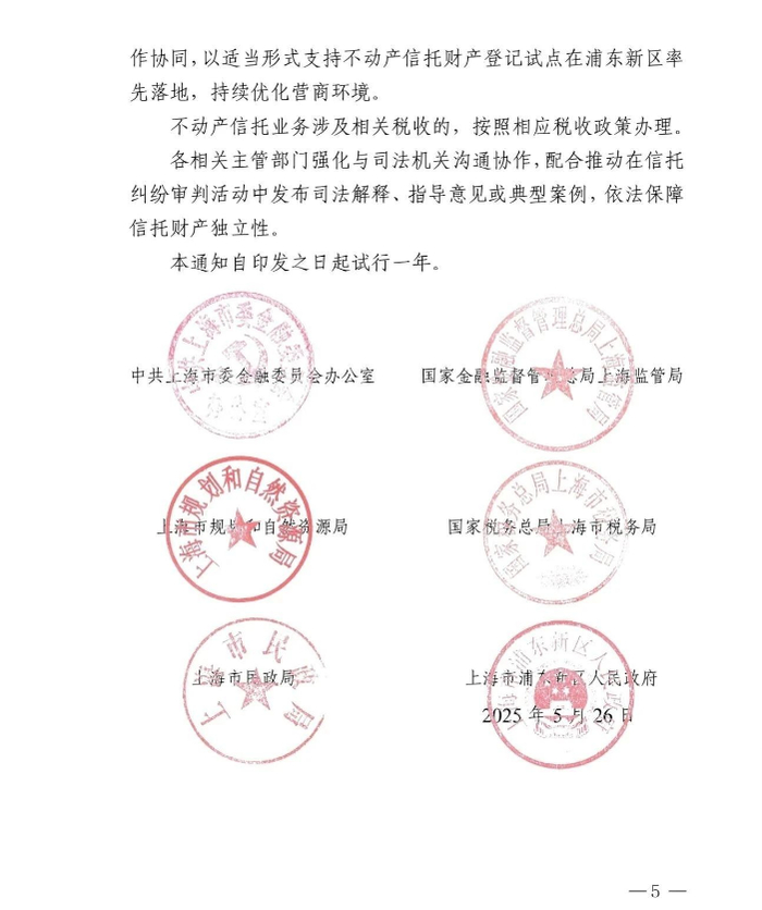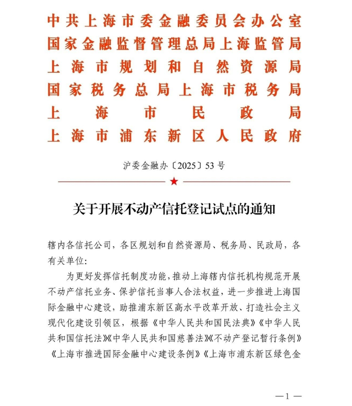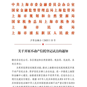 2025年5月27日,中共上海市委金融委员会办公室、国家金融监督管理总局上海监管局、上海市规划和自然资源局、国家税务总局上海市税务局、上海市民政局、上海市浦东新区人民政府联合发布了《关于开展不动产信托登记试点的通知》。