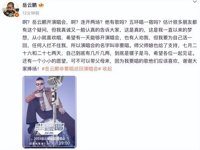 5月27日,知名相声演员岳云鹏发文宣布自己要开演唱会了。