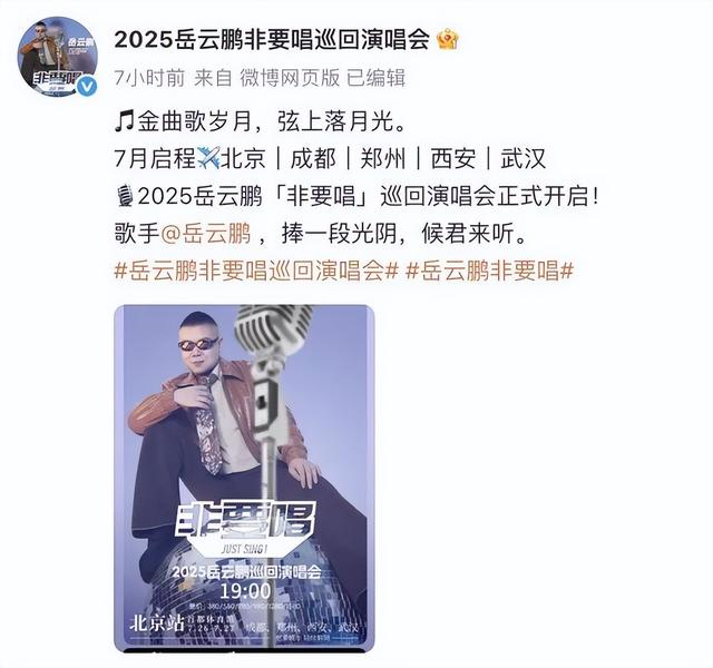 据悉,岳云鹏的“非要唱”巡回演唱会将于7月26日至27日19时在首都体育馆举行。