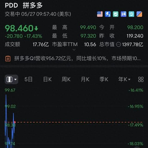 5月27日,拼多多开盘跌逾17%,股价跌破100美元/股。
